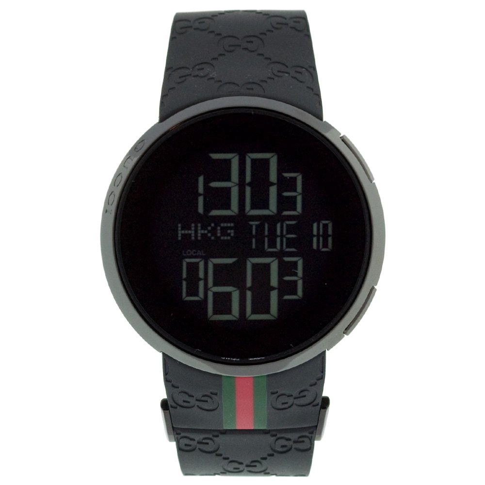 Italian fashion meets digital sleekness in Gucci's I-Gucci Watch. Its black dial provides a large screen for viewing its red digital display. A black rubber band with Gucci-logo texturing adds some subtle style, and a short stripe of red and green on one edge of the band adds a little color to its nearly all-black appearance. A dual-screen design allows for tracking the time in two zones. A stainless steel case, water-resistance to 330 feet (100 meters), and quartz movement mean quality. Thanks to a push-button clasp with buckle, this sleek Gucci stays put.