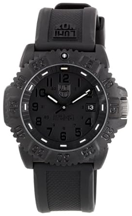Black carbon-reinforced polymer case with a black rubber strap. Unidirectional ratcheting black carbon-reinforced polymer bezel. Black dial with luminous hands and black Arabic numeral hour markers. Minute markers around the outer rim, GMT scale. Dial Type: Analog. Luminescent hands and dial markers. Date display at the 3 o'clock position. Swiss quartz movement. Scratch resistant mineral crystal. Protected crown. Screw down black carbon reinforced case back. Case diameter: 44 mm. Case thickness: 10 mm. Band width: 23 mm. Tang clasp. Water resistant at 200 meters / 660 feet. Functions: date, GMT, hour, minute. Sport watch style. Luminox Evo Navy Seal Blackout Mens Watch 3051.BLACKOUT.
