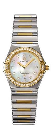 Omega's Constellation watch for women is an elegantly designed timepiece featuring stainless steel and 18-karat-gold band, a stainless steel, 25-millimeter case, mother-of-pearl dial, diamond indexes at each hour, and an 18-karat-gold bezel with diamonds. This stunning watch is water resistant to 99 feet and features precision Swiss-quartz movement. Wear the Constellation with any professional or formal ensemble for a perfect combination.